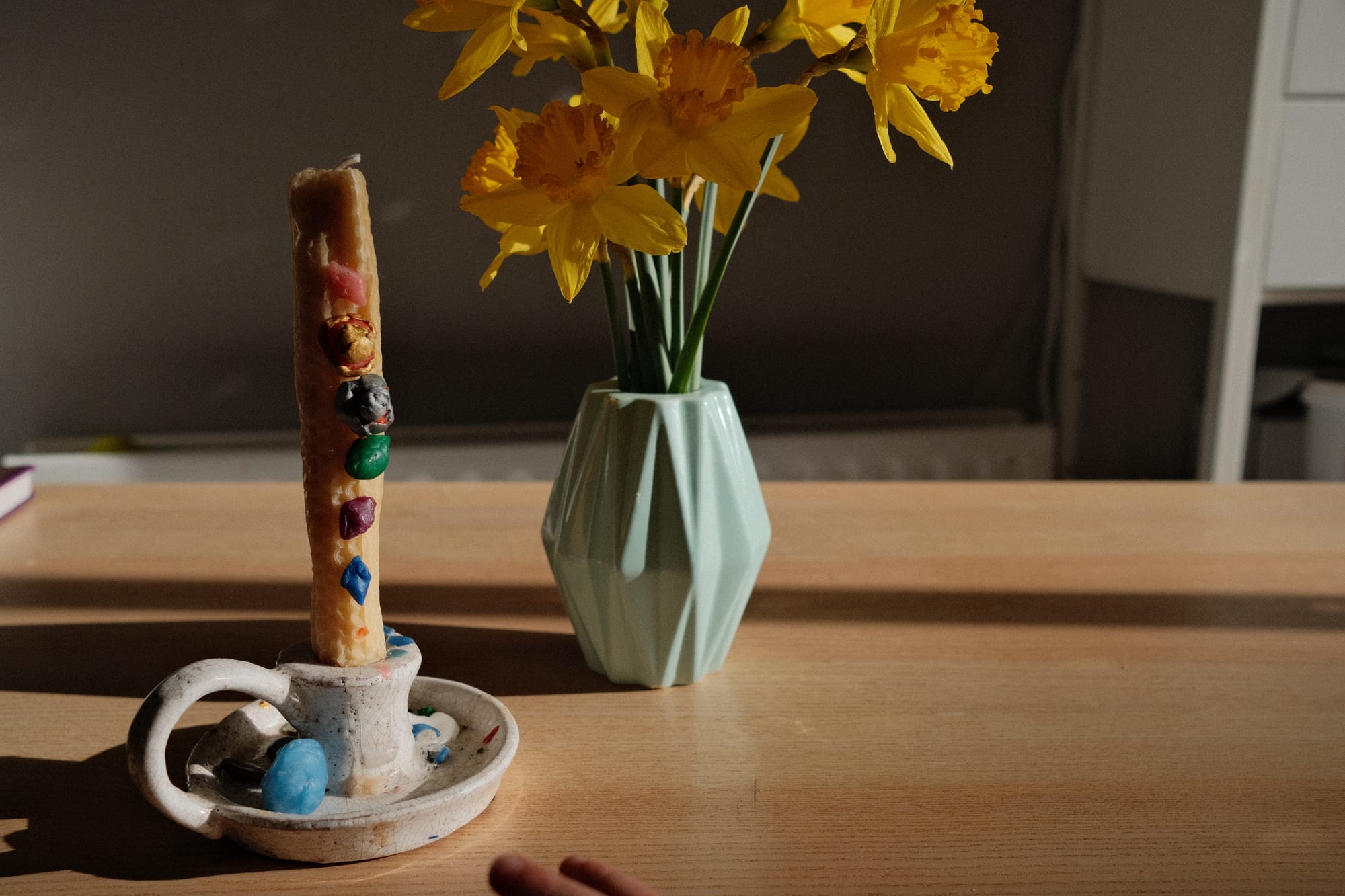 He made and decorated this candle at school as part of Imbolc celebrations at the start of the month, to remind us “of returning light, hope and warmth.”