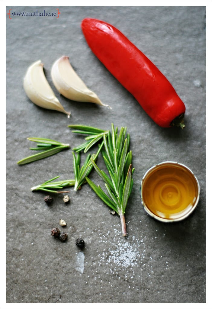 Mix the finely chopped garlic, chilli and rosemary with a little olive oil and some soy sauce. Rub some salt and pepper into the steak (after giving it it a few goes with the tenderiser - very therapeutic!), pop it in a sandwhich bag with the mix then put it in the fridge and wait with a glass of wine until you're ready for it. Yum!