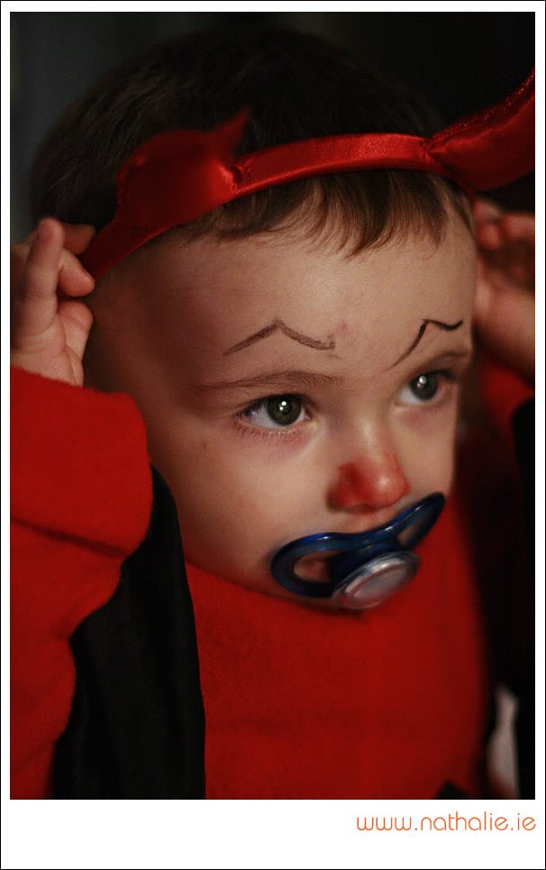 But he kept pulling his hood off, so we tried him with a devil horn hairband, which didn't stay put long.