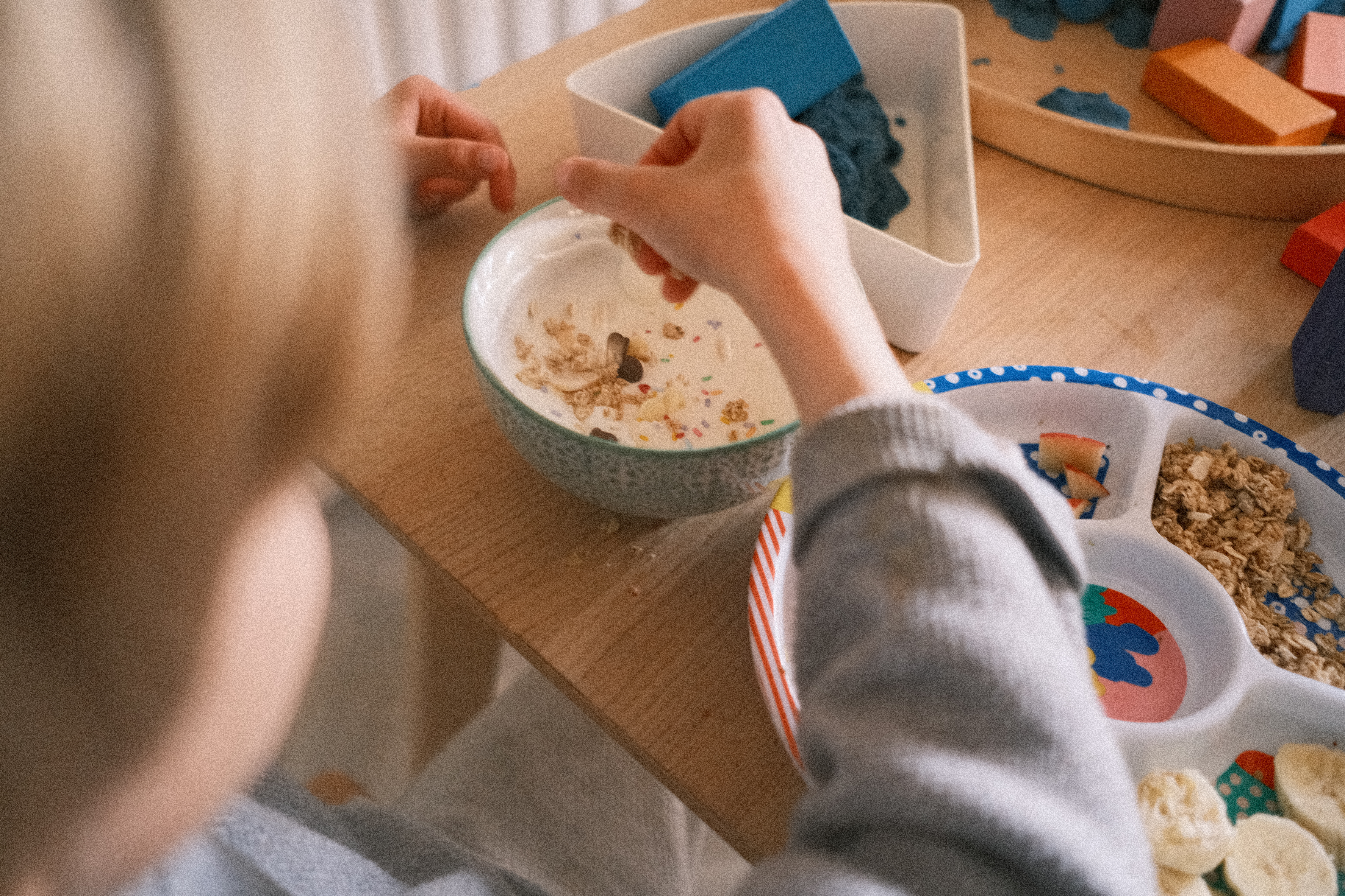 His favourite snack at the moment is something we call “yoghurt pick ‘n’ mix” – quick and dirty pic above. He gets a bowl of natural yoghurt and a I fill each compartment of the plate with an assortment of toppings; usually banana, granola (both previously on the “no thanks” list), chopped apple, and chocolate chips, apple sauce or sprinkles. The whole thing is devoured.
