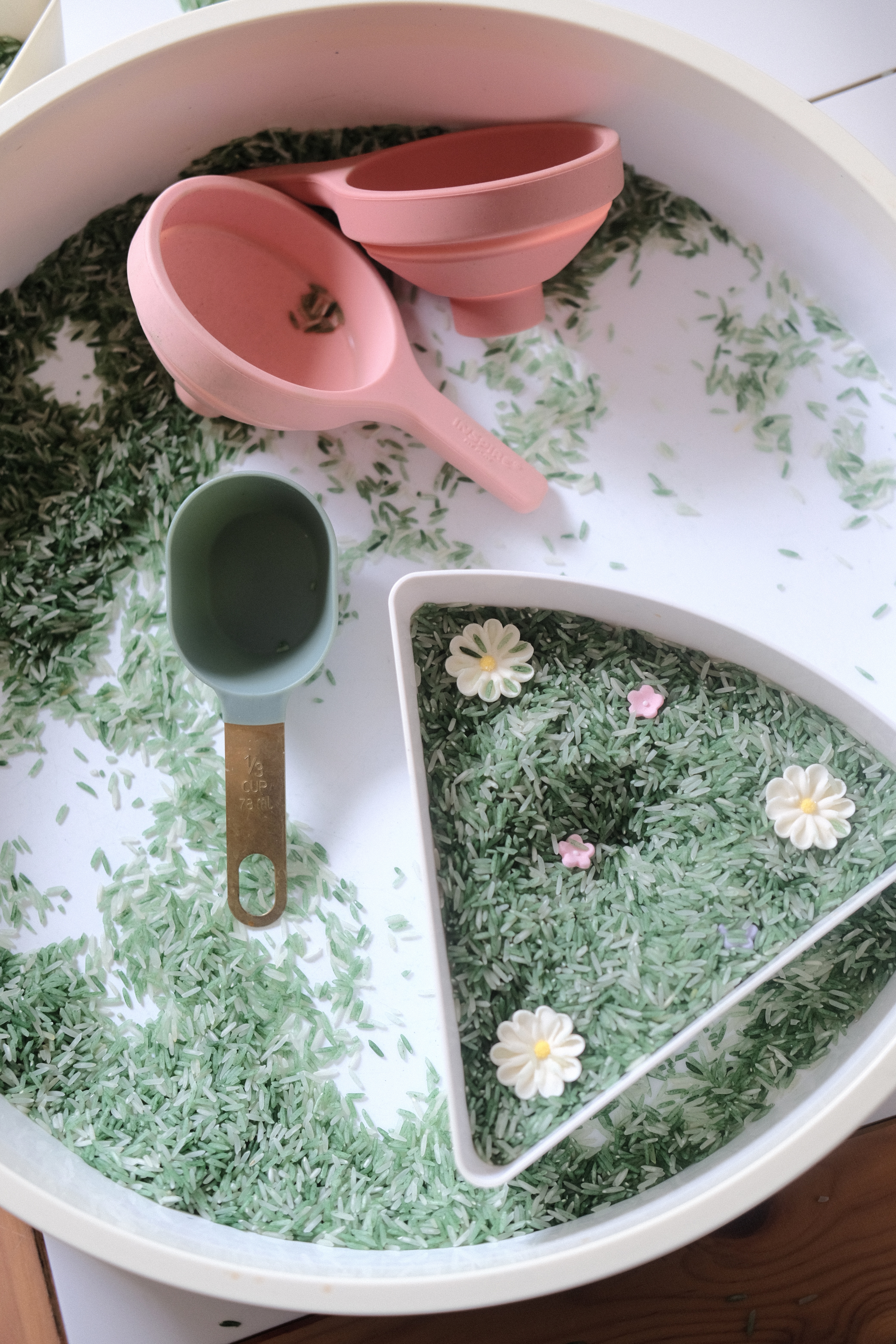 This was part of Ada’s second birthday present and inspired by this Inspire My Play post (the PlayTray pictured above has been going strong for 5+ years now, though the funnels – by the same brand – are new). I used food colouring to dye some old rice and added edible flowers, which I ordered from Irish company Sugar Sisters.