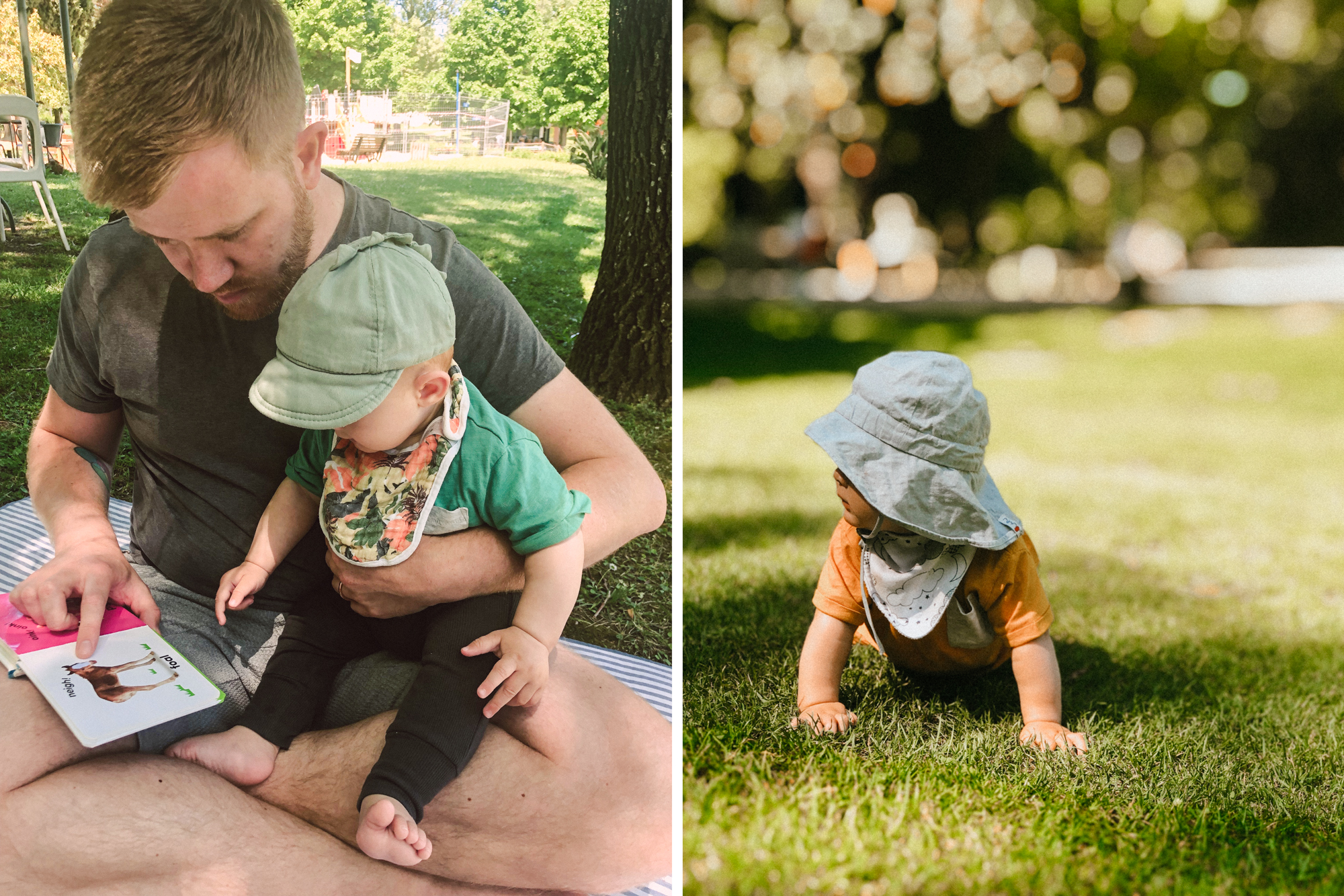 While we're still at the grass-isn't-for-eating stage, the book has motivated me to ensure we spent as much time outdoors as possible. As we live in a small fourth floor apartment, getting outdoors usually means hitting up a local park. Sometimes, Ari just hangs out on the picnic blanket, taking the world in. Other times, he tentatively crawls off it, pulling at the grass, examining twigs and yes, often trying to put whatever he finds into his mouth!